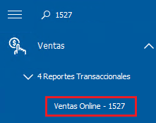 En el menú lateral izquierdo se dirige al módulo de Ventas -> 4Reportes Transaccionales -> Ventas Online - 1527.