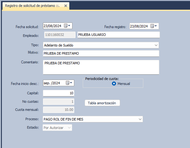 Registrar una solicitud de préstamo de un empleado en el sistema.