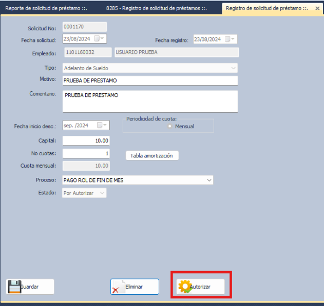 Procedemos a autorizar el documento, dando doble clic a la solicitud se abrirá una nueva ventana.