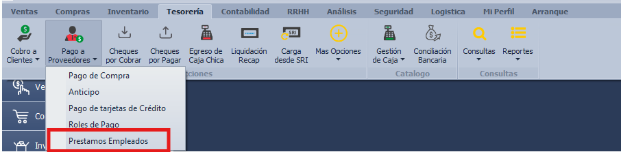 Para realizar el pago de préstamo a empleado, seleccione en el menú superior o cinta el módulo Tesorería.