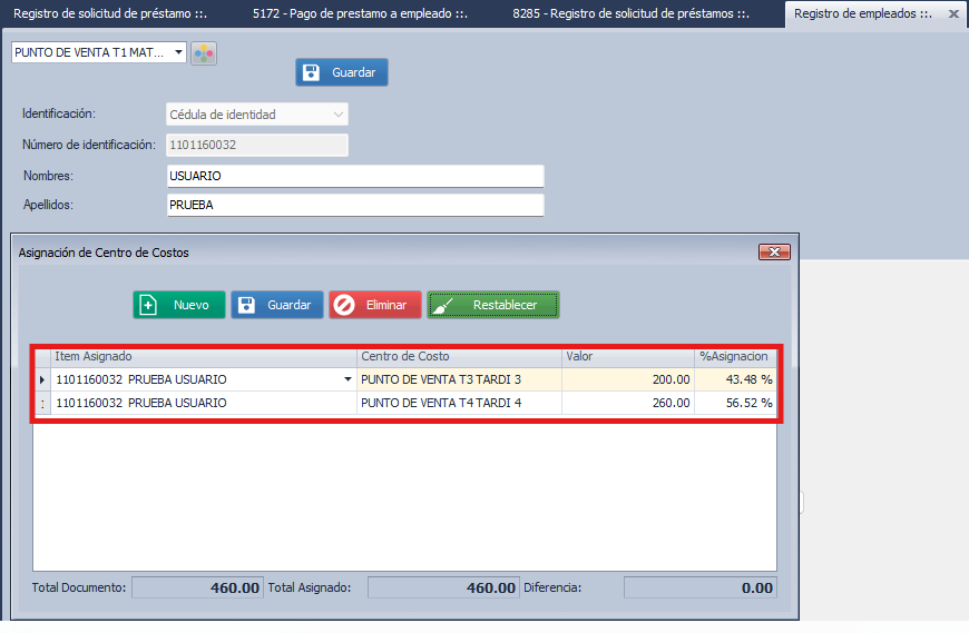 Comprobamos la asignación de Centro de Costos con reglas asignado al empleado, esta distribución se realizo en la configuración del empleado en la opción 8160.