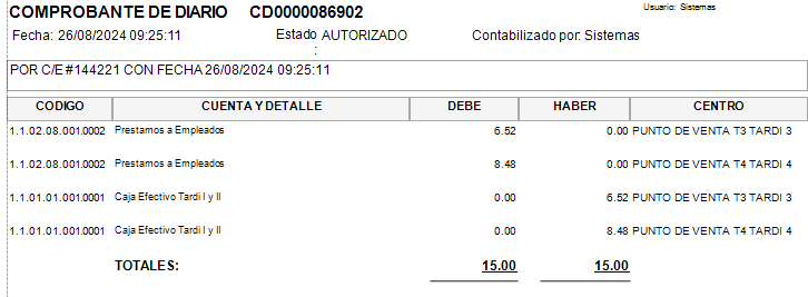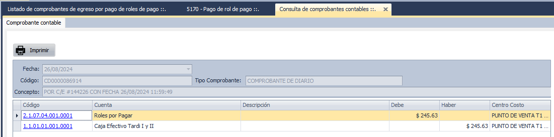 Podrá visualizar los movimientos contables generados por la transacción, la cual respeta la configuración del empleado asignado Centro de costos.