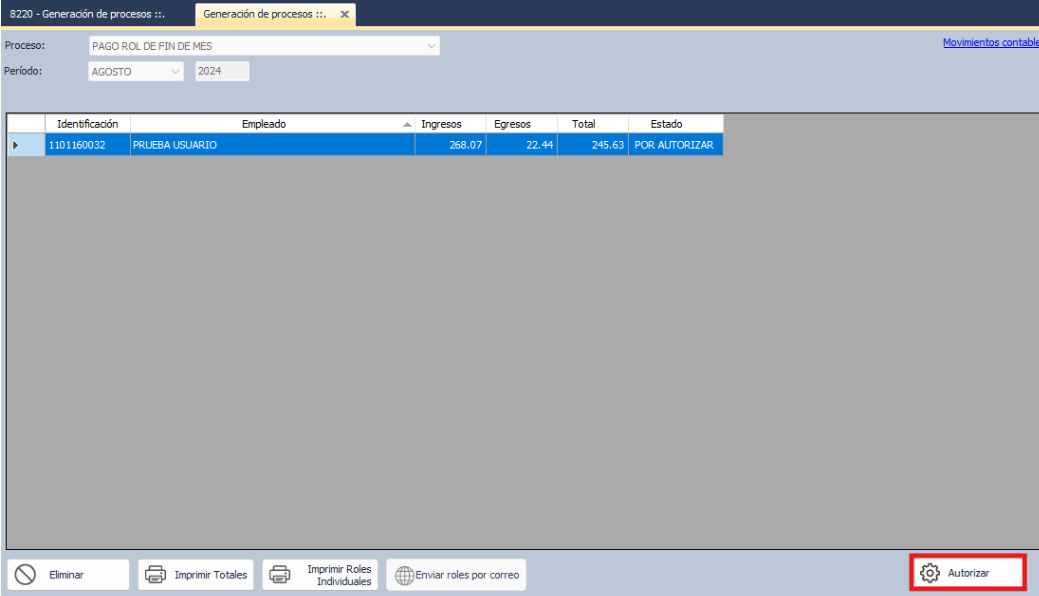 Aparece una ventana donde tendremos que autorizar el proceso de Nómina generado, dar clic en Autorizar.