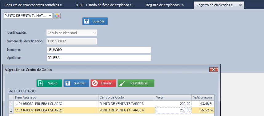 Generar el proceso de nómina del empleado con distribución de centro de costos.