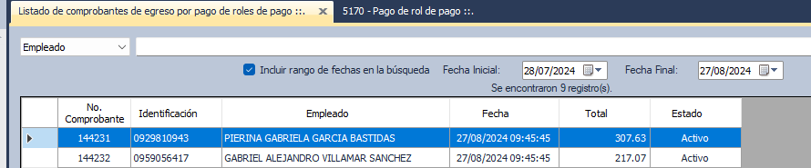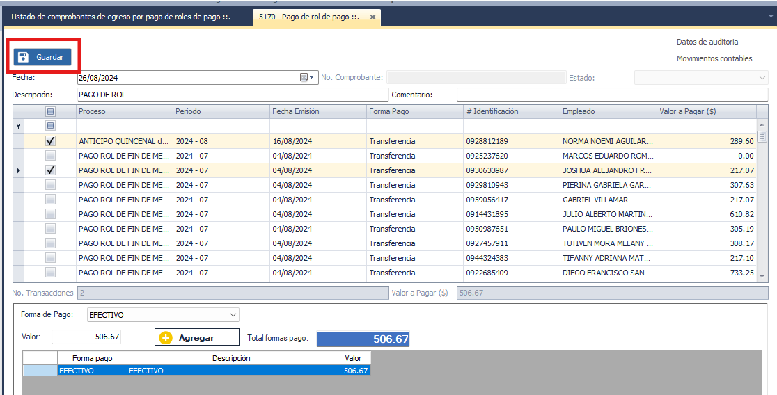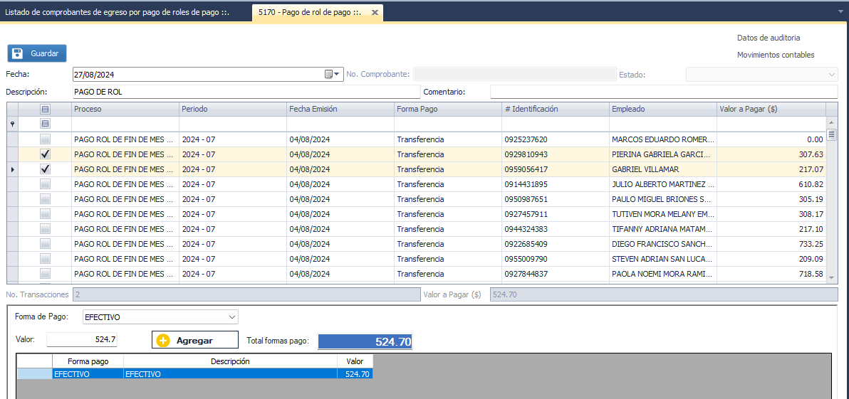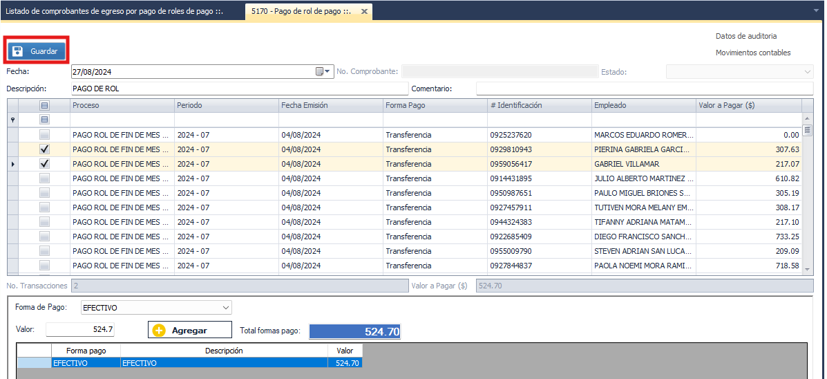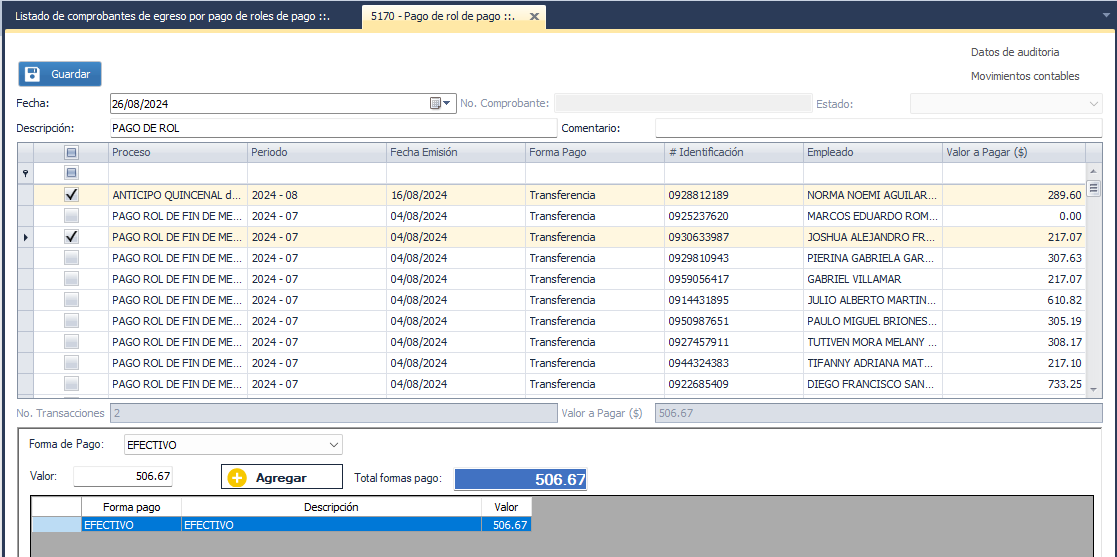 Se abrirá una nueva ventana, donde se seleccionará los empleados a pagar.
