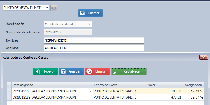 Comprobamos la asignación de Centro de Costos a los empleados, esta configuración se realizo en el empleado en la opción 8160.