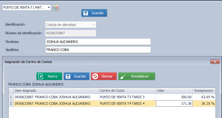 Comprobamos la distribución de Centro de Costos con reglas asignado a los empleados, esta distribución se realizo en la configuración del empleado en la opción 8160.