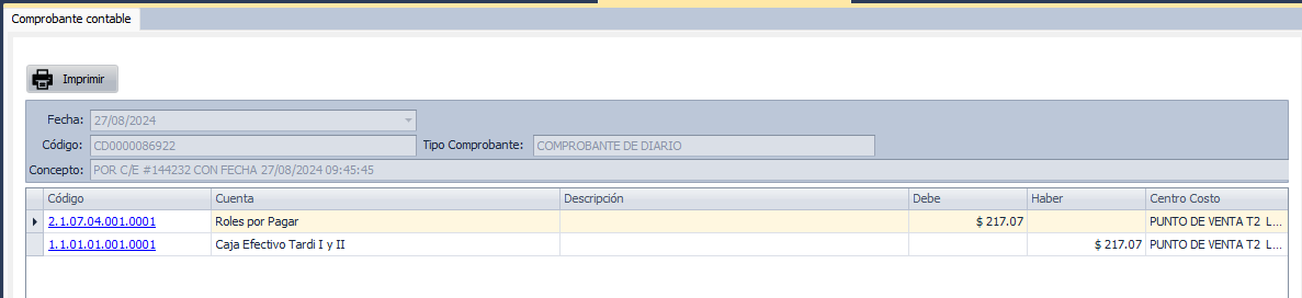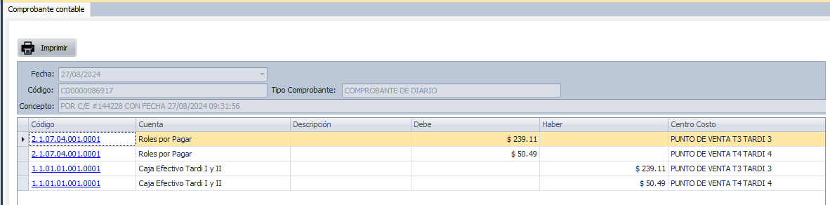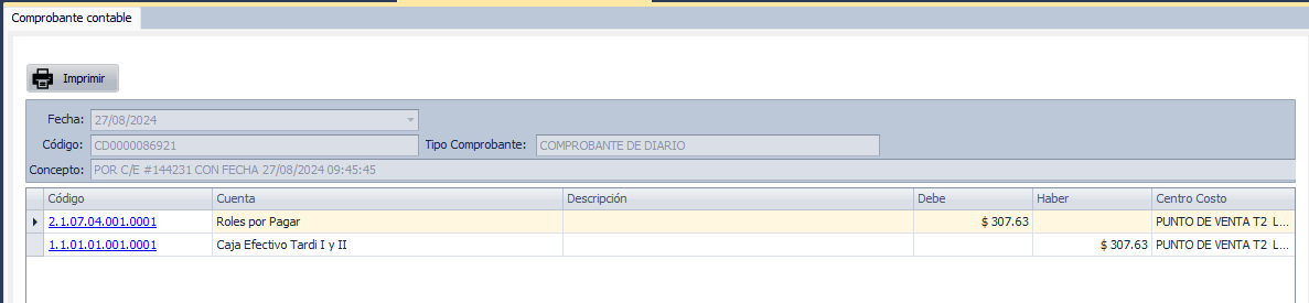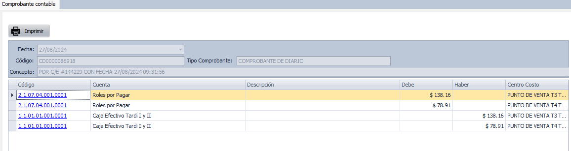 Podrá visualizar los movimientos contables generados por la transacción de Rol de Pago masivo, la cual respeta la configuración del empleado asignado a Centro de costos.