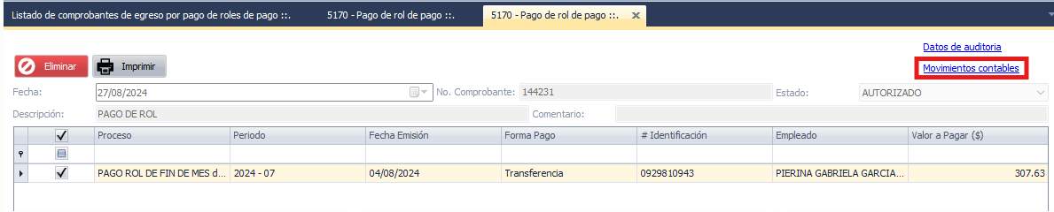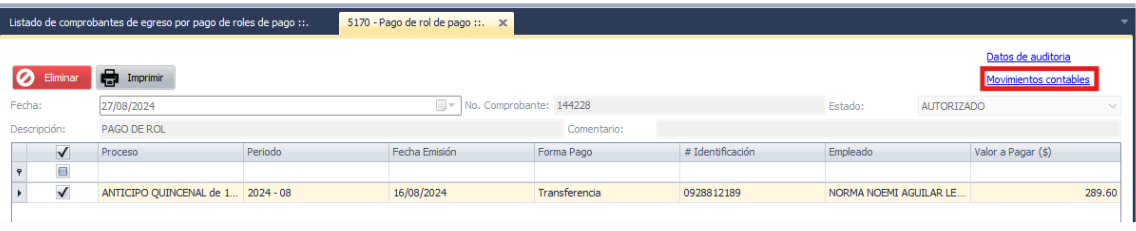 Para consultar el pago de rol generado, dar doble clic en el comprobante, posteriormente dar clic en movimientos contables.