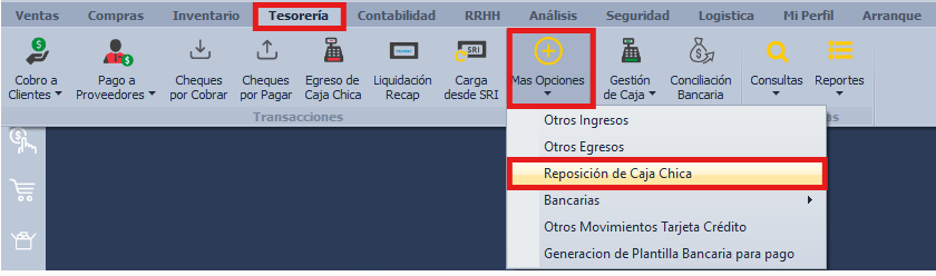 En la cinta de opcines ingrese al módulo de Tesorería -> Más opciones -> Reposición de Caja Chica.