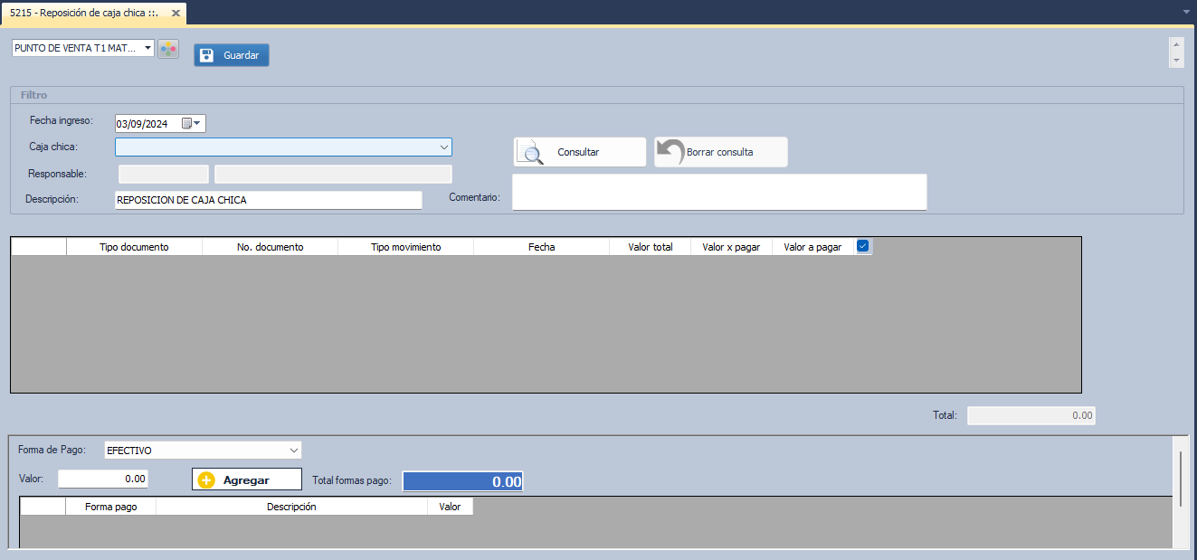 Para registrar una reposición de caja chica, debe llenar los siguientes campos: