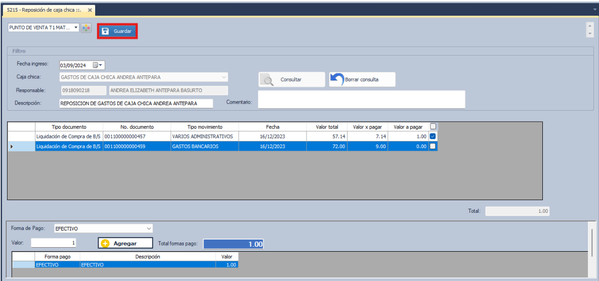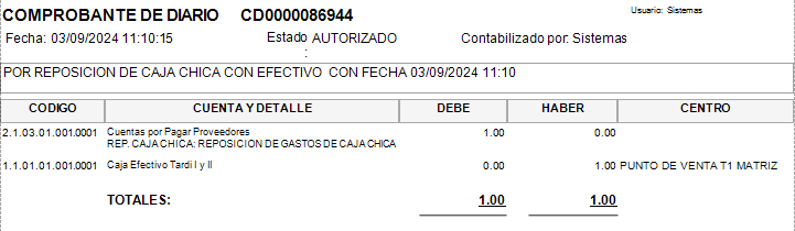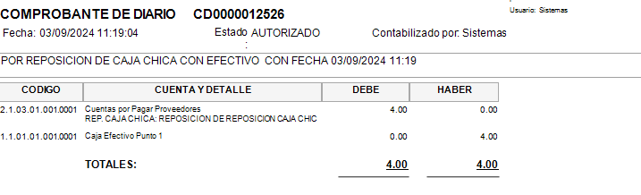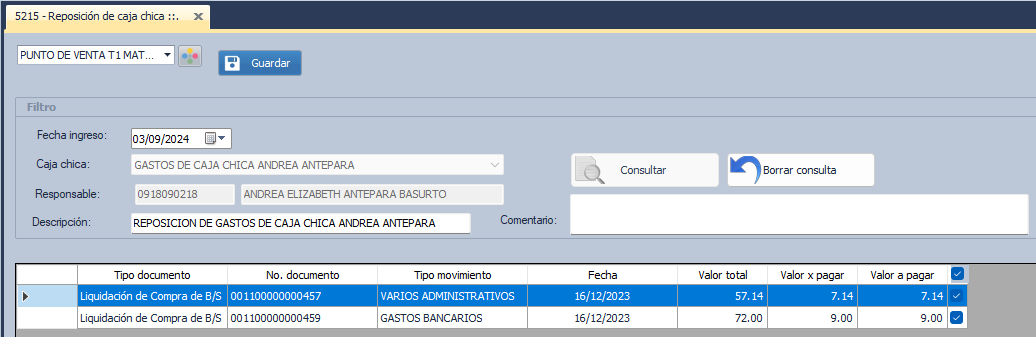 - Seleccione el número de documento a realizar la reposición de caja chica.