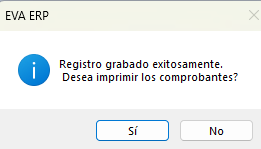 Aparece una ventana de información, indicando que se grabó de forma correcta la transacción y si desea imprimir los comprobantes contables. Procedemos a dar clic en el Sí.