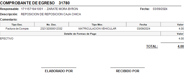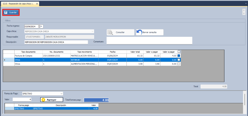 Finalmente se cargarán los campos de forma automática del Responsable, Descripción y Documentos pendientes de realizar la reposición de caja chica.