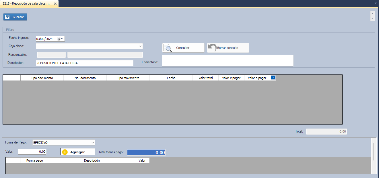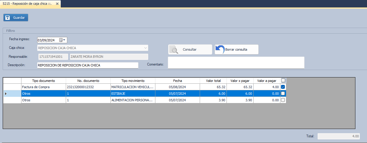 - Fecha Ingreso: Seleccione la fecha del ingreso de la reposición de la caja chica.