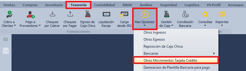 Desde la cinta de opciones del sistema ingrese a Tesorería- Más Opciones- Otros Movimientos Tarjeta Crédito.