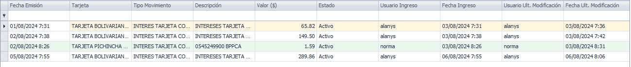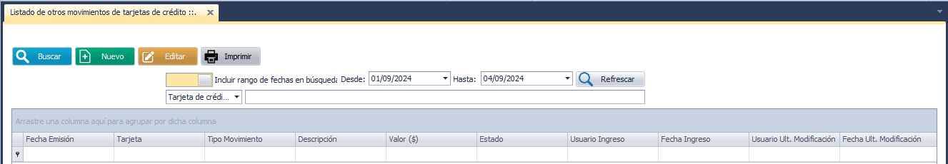 Se apertura la ventana con el nombre Listado de otros movimientos de tarjetas de crédito.