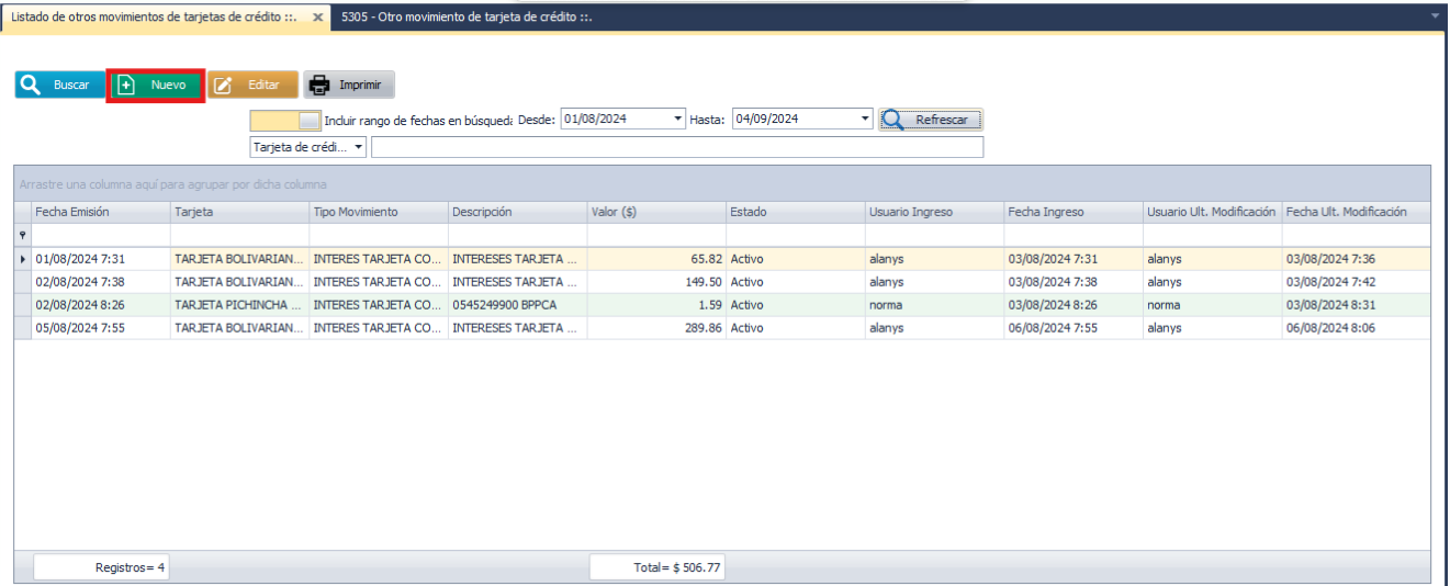 Para registrar un nuevo Movimiento de tarjeta de crédito, de clic en Nuevo:
