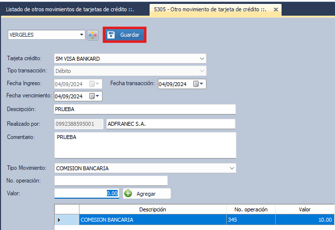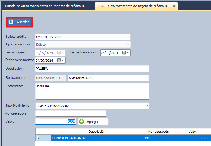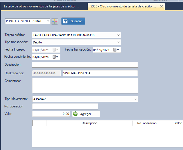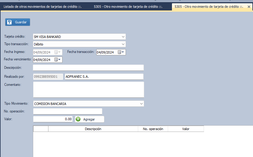 Se apertura la ventana con el nombre 5305- Otros movimientos de tarjetas de crédito.