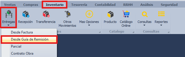 Seleccione la opción Entregas->Desde Guía de Remisión.