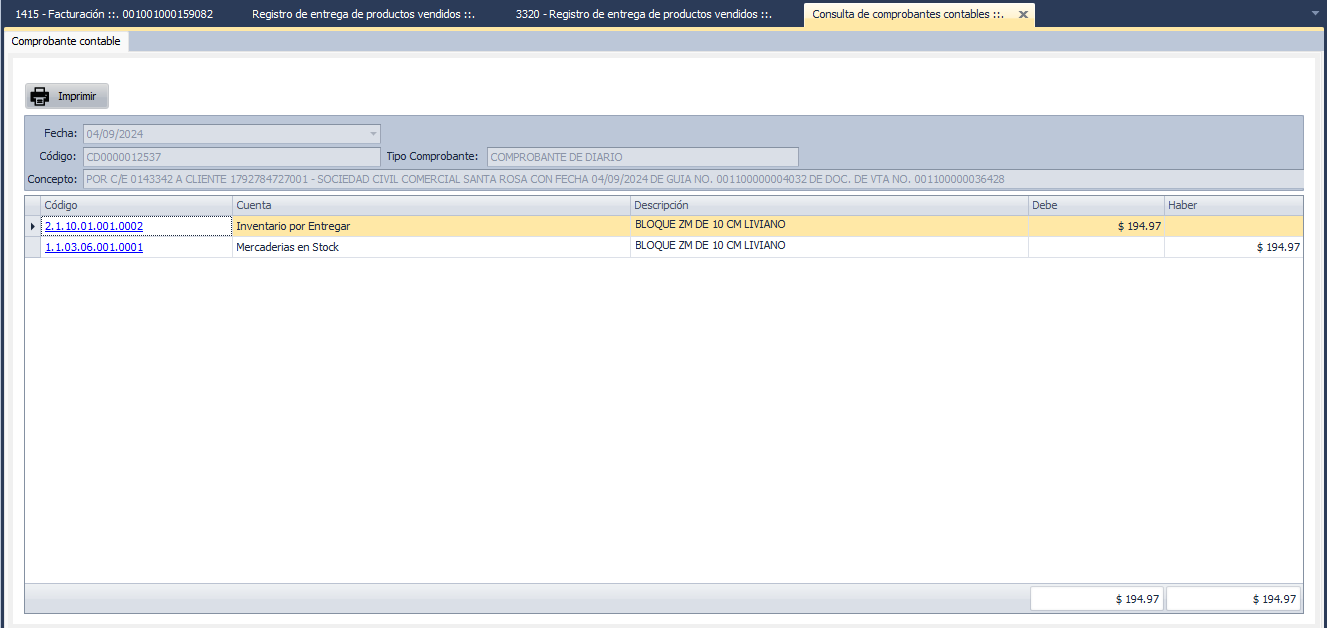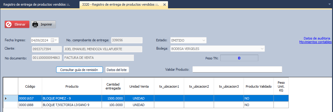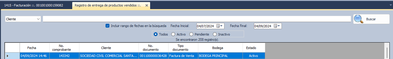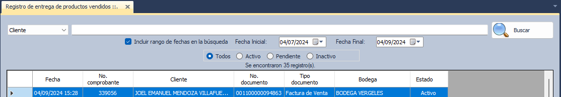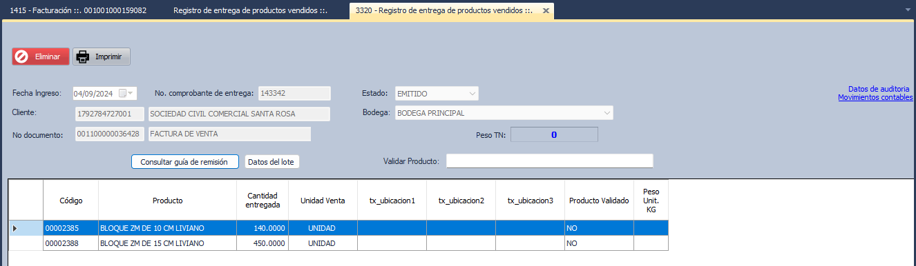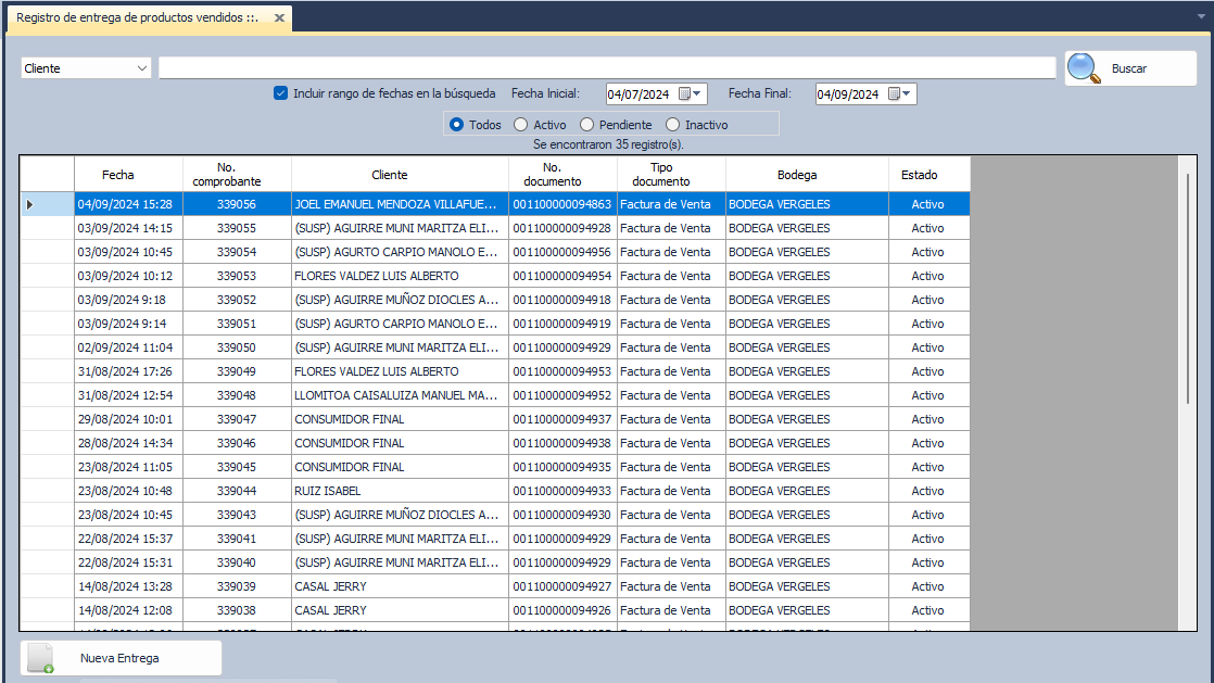 En la parte inferior se muestran las entregas de productos por número de comprobante que se encuentran registrados en el sistema: