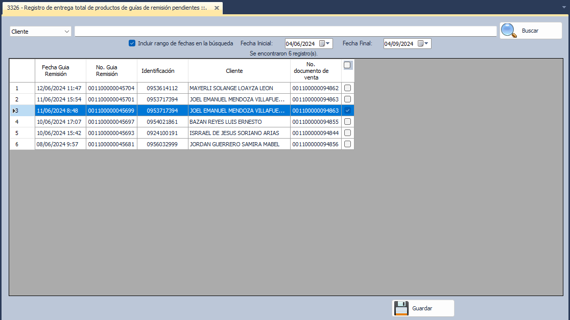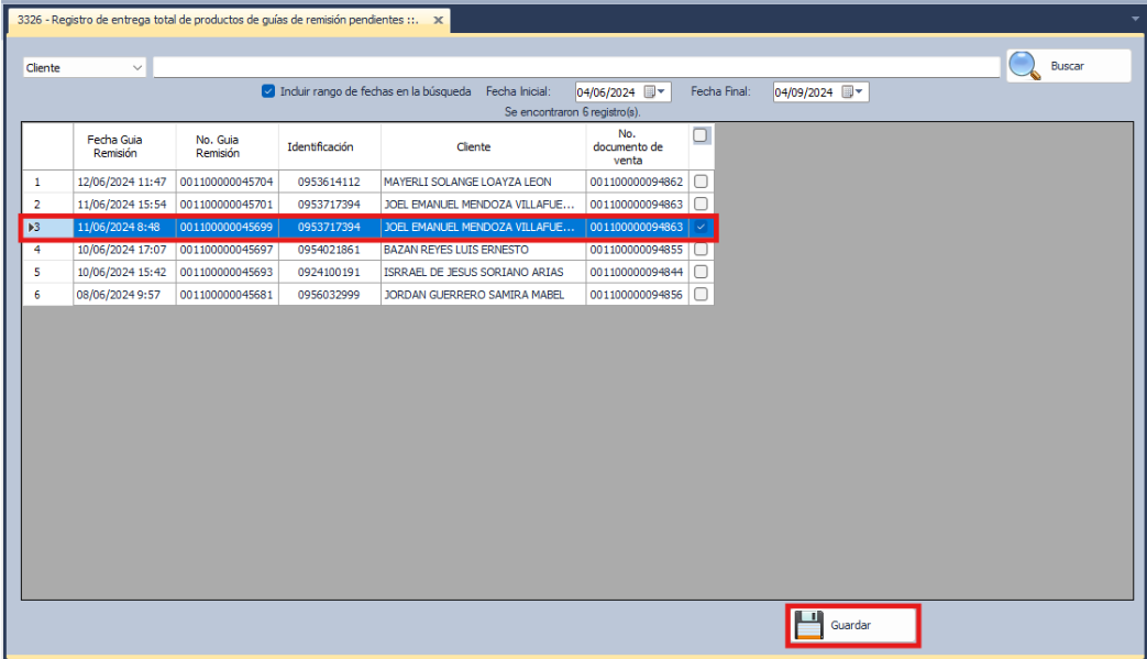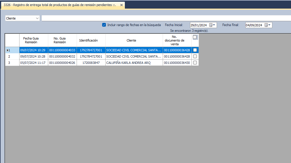 Se apertura la ventana con el nombre 3326 - Registro de entrega total de productos de guías de remisión pendientes.