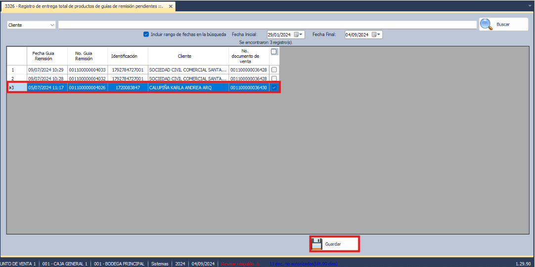Seleccionar con el check, en la factura a realizar la entrega total del producto y dar clic en Guardar.