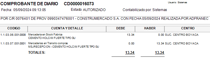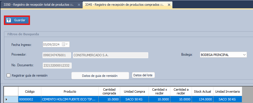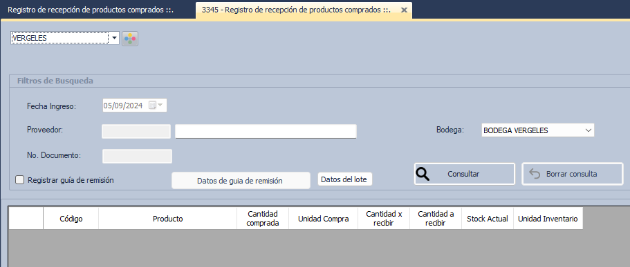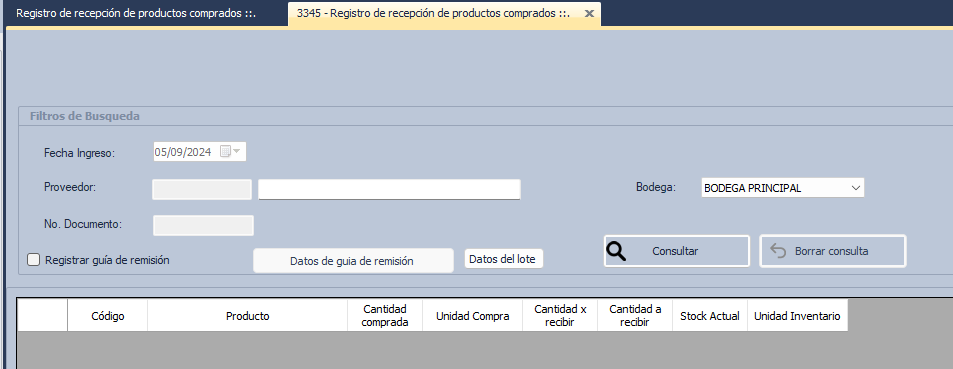 Se apertura la ventana con el nombre 3345 - Registro de recepción total de productos comprados.