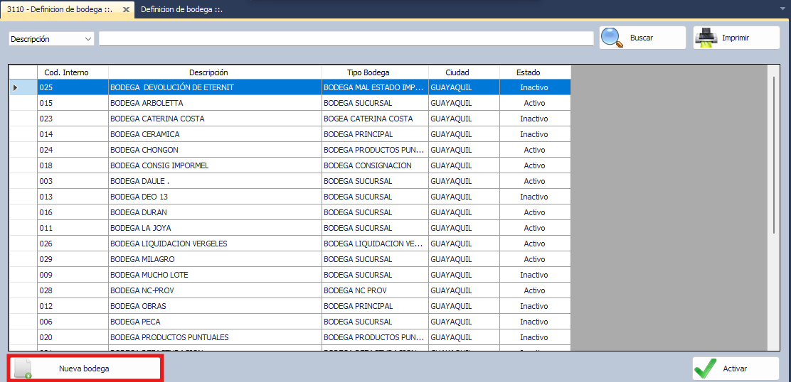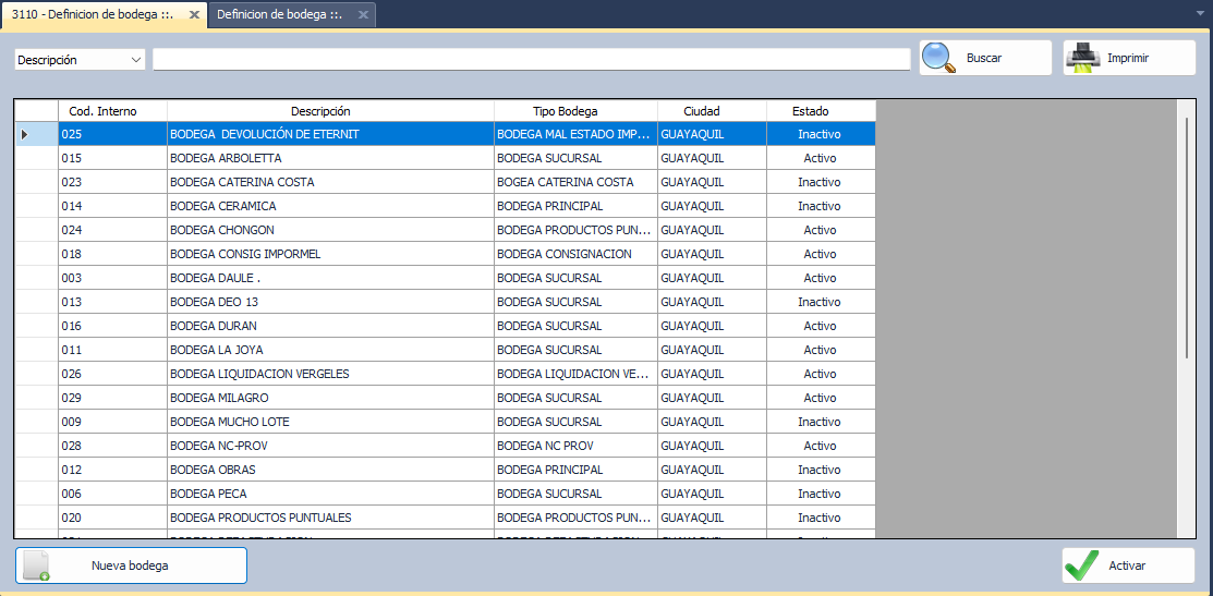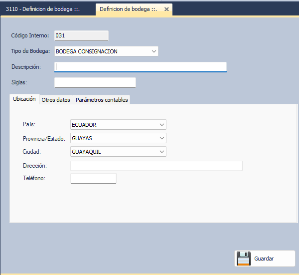 Se apertura la ventana con el nombre 3110 - Definición de bodega.
