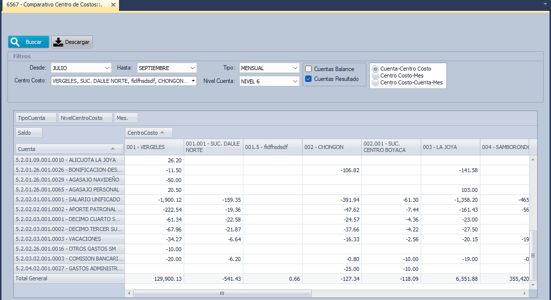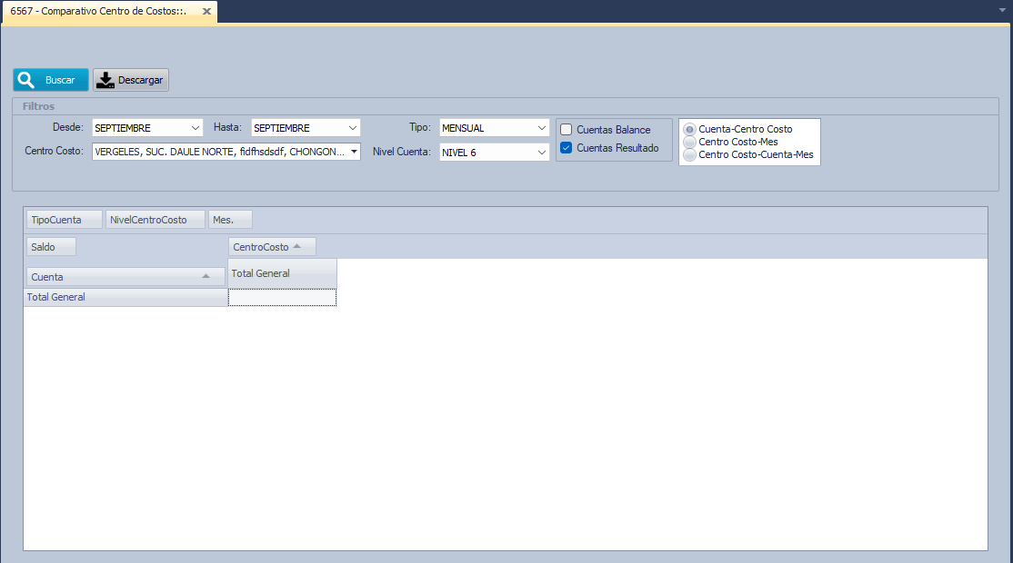 Se apertura la ventana 6567- Comparativo Centro de Costos.