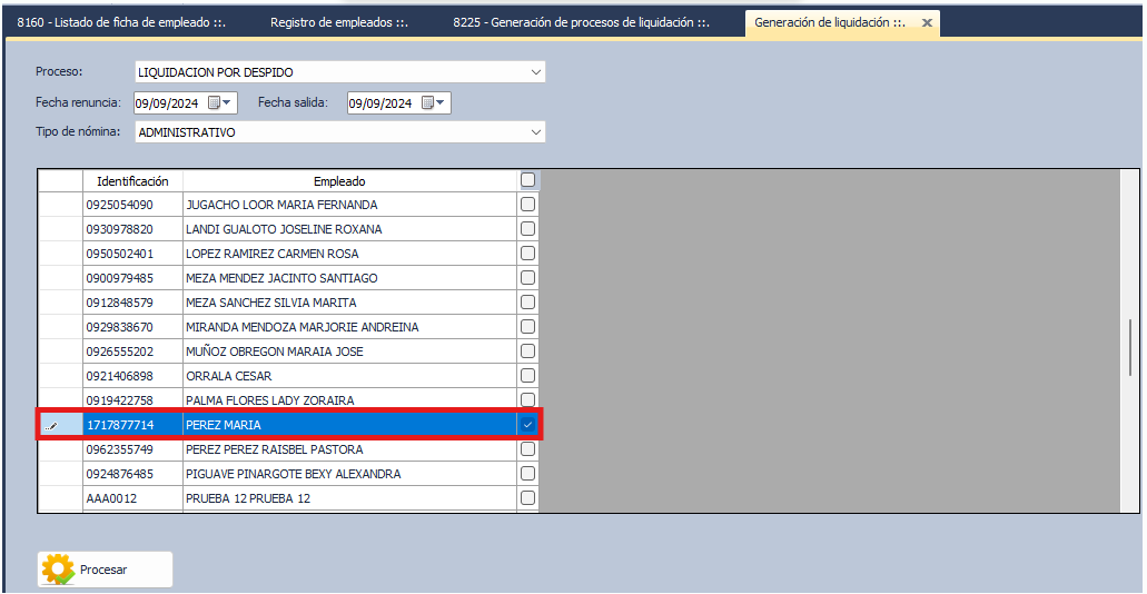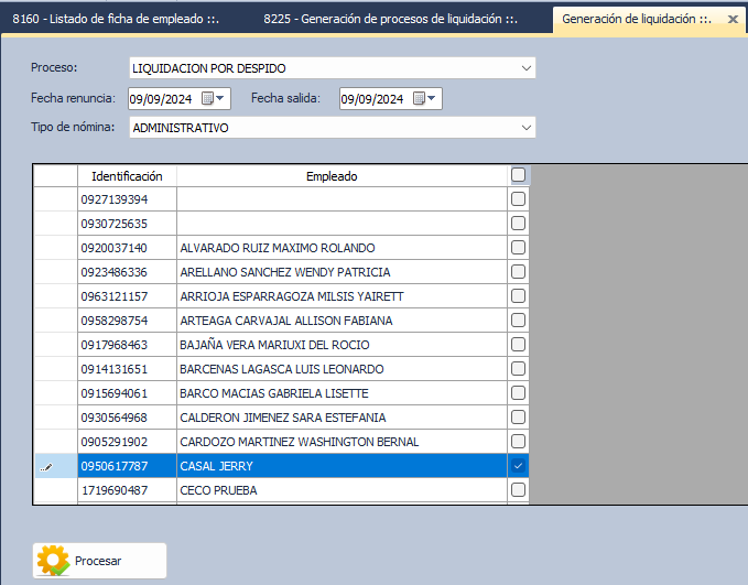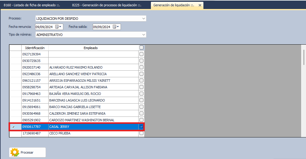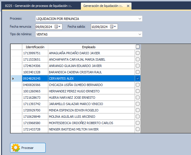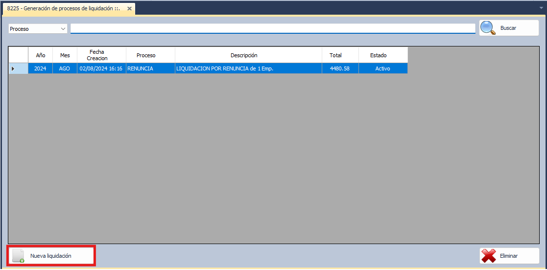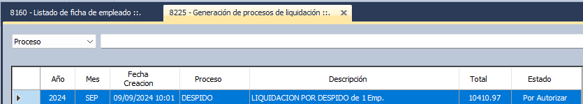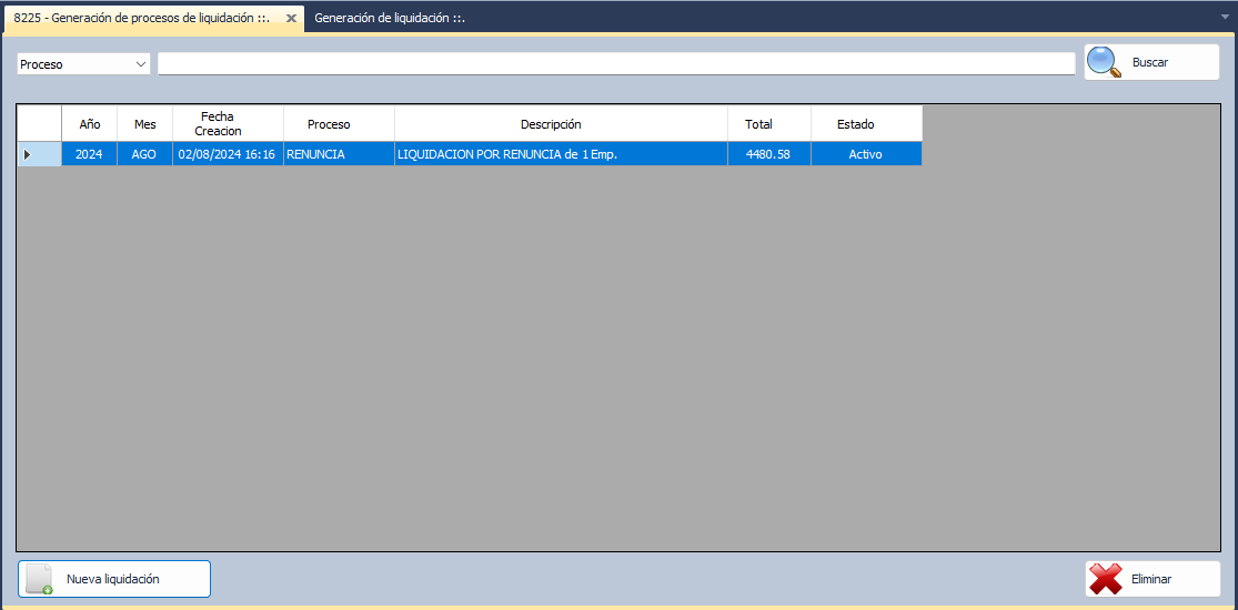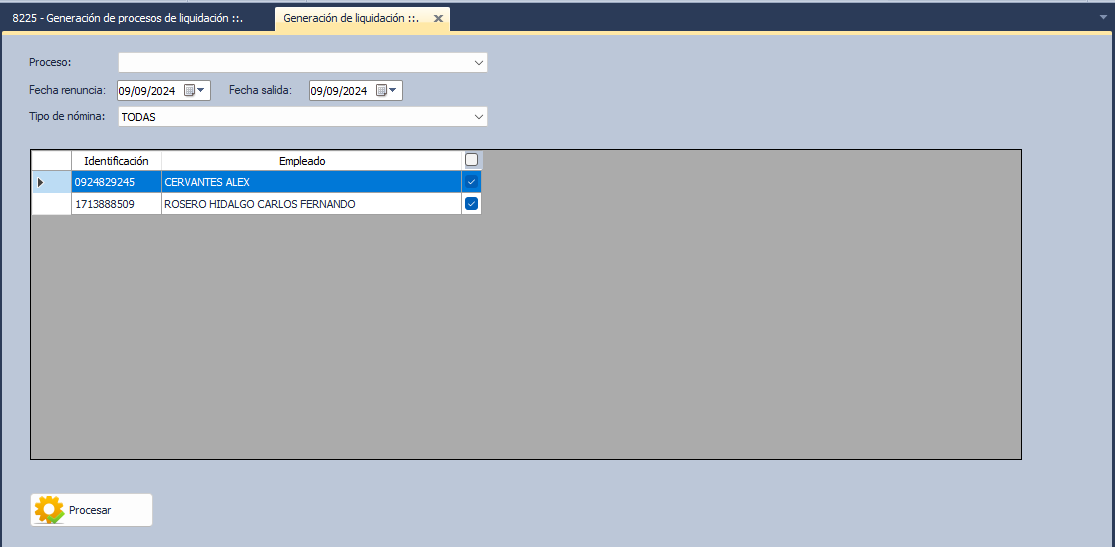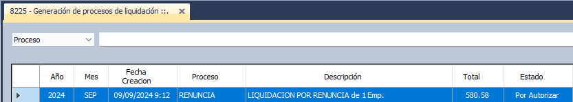 Se apertura una nueva ventana con el nombre de 8225-Generación de procesos de liquidación.