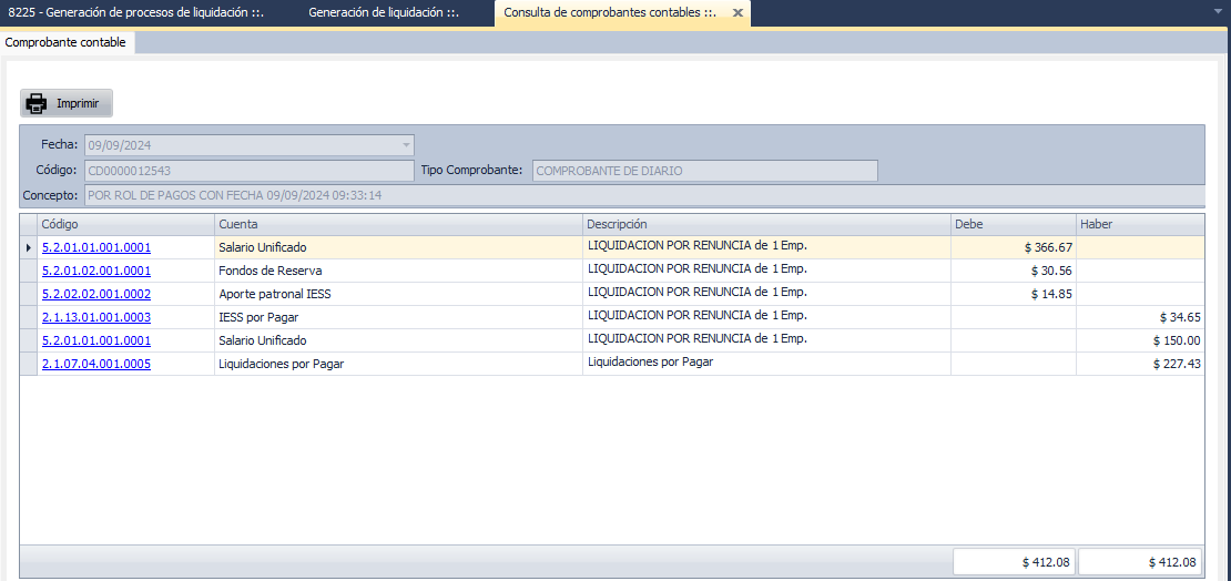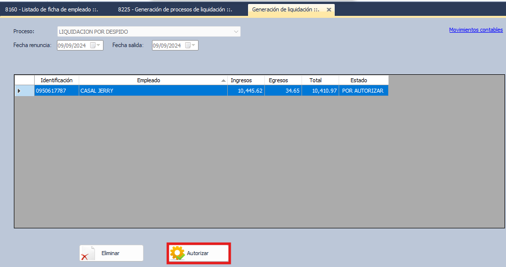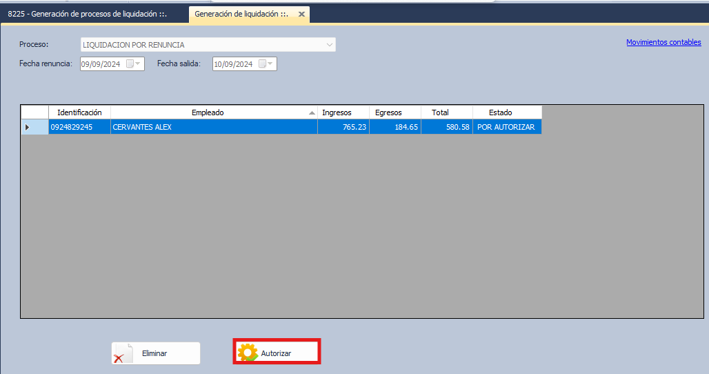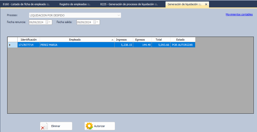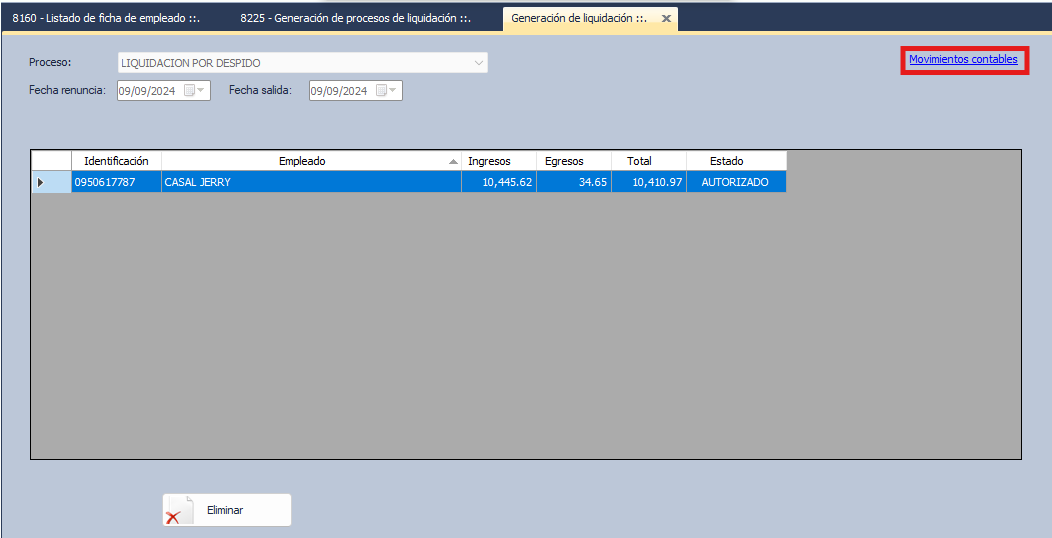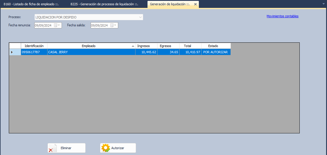 Se apertura una nueva ventana con el nombre de 8225-Generación de procesos de liquidación.