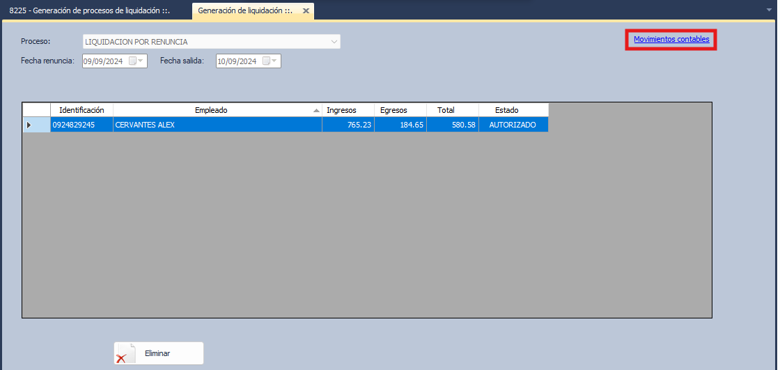 Seleccione la fecha de renuncia y la fecha de salida de la lquidación a generar.