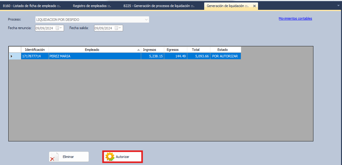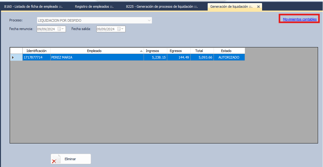 Para realizar la liquidación del empleado en el sistema, seleccione en el menú izquierdo Recursos Humanos- Procesos de Nómina- Liquidación de Empleado- 8225.