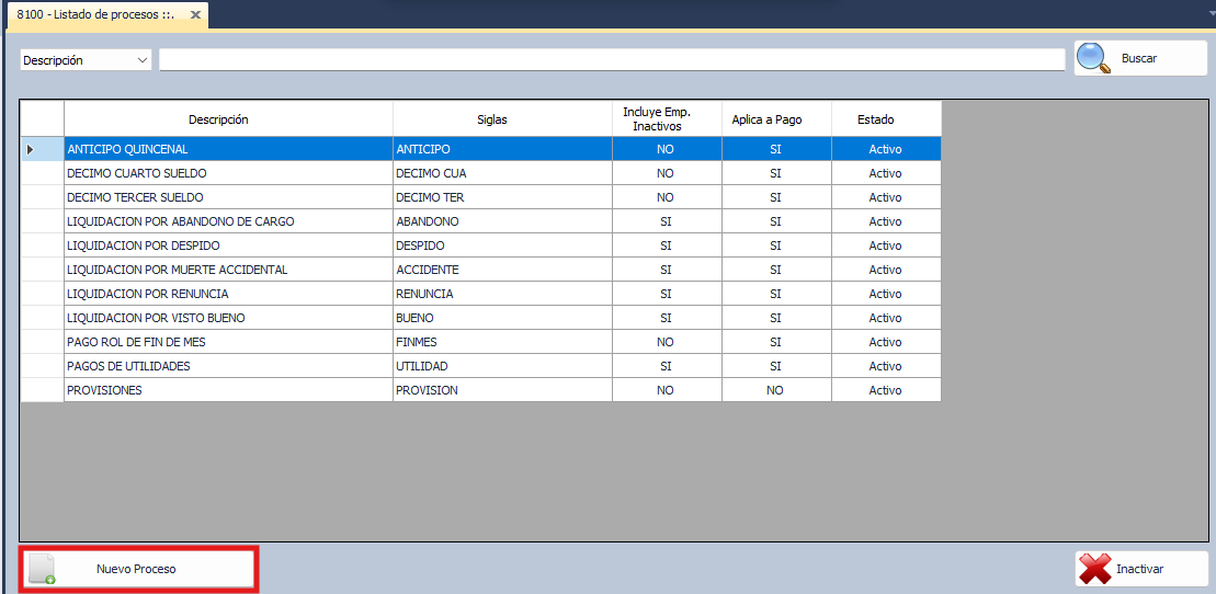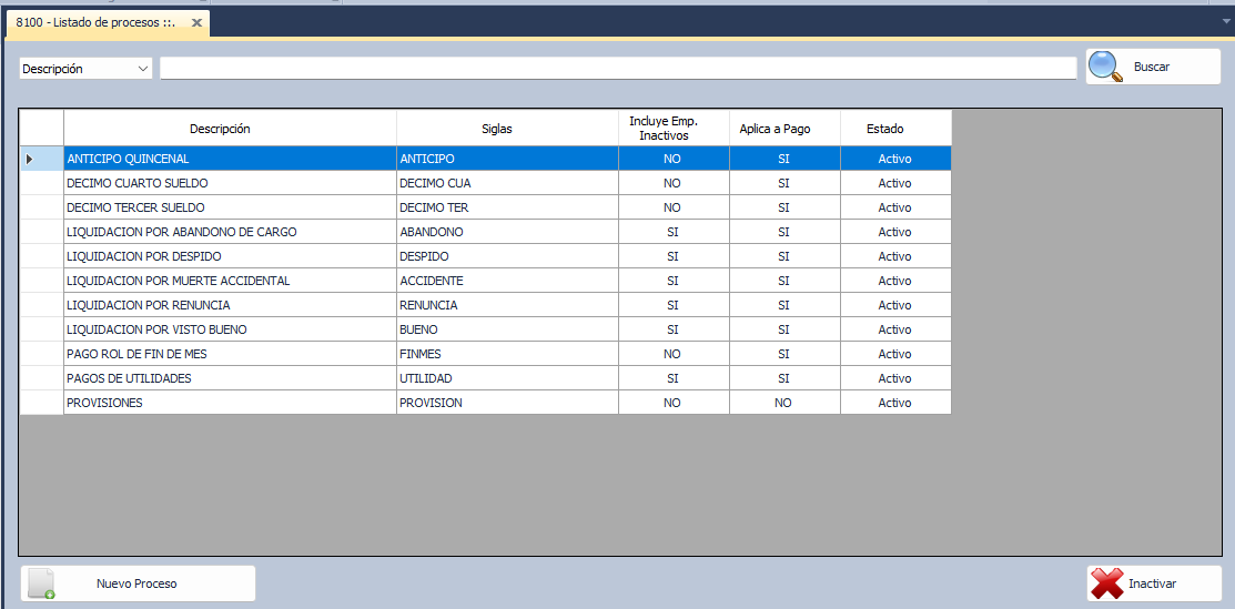 Se apertura una nueva ventana con el nombre de 8100-Listado de procesos.