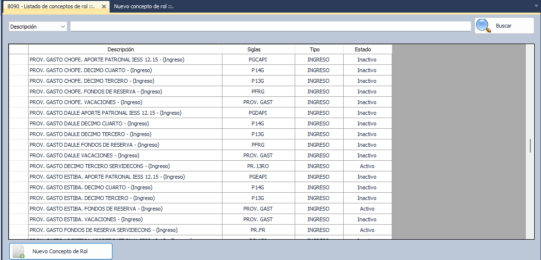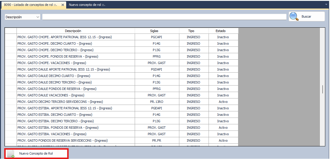 Se apertura una nueva ventana con el nombre de 8090-Listado de de Conceptos de Rol.