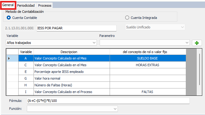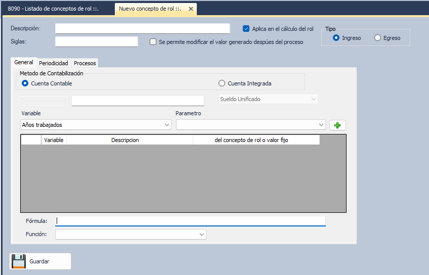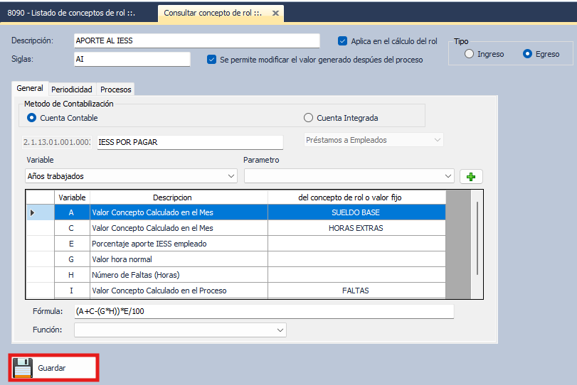- Una vez ingresada todas las variables en el concepto de rol a crear, añadir la Fórmula de este nuevo rol.