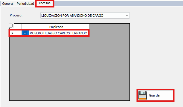 - Seleccione el Proceso a aplicar en el nuevo rol, y añada los empleados a aplicar.