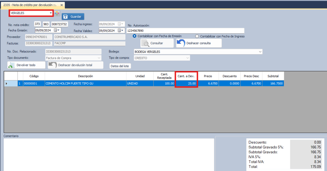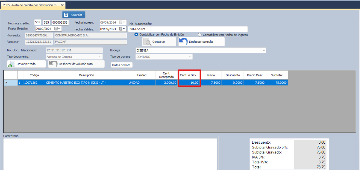 Caso contrario colocar la cantidad a devolver en el campo "Cant. a Dev."