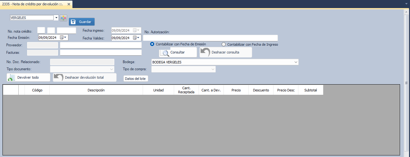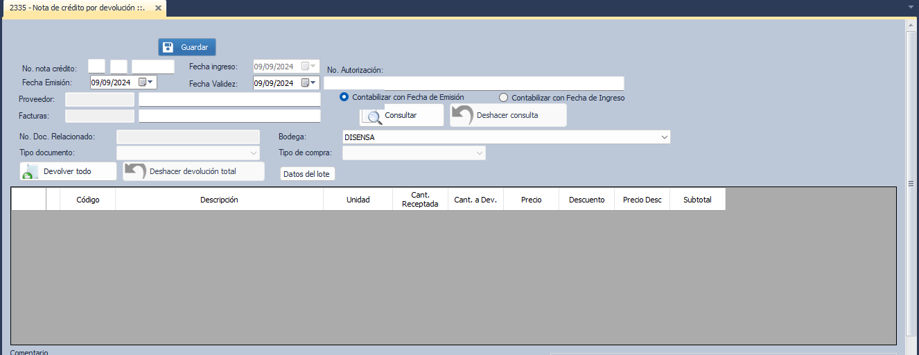 Se apertura una nueva ventana con el nombre de 2335- Nota de crédito por devolución.
