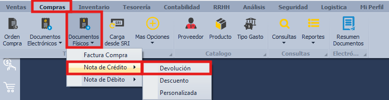 Desde el menú superior ingrese a Compras- Documentos Físicos- Nota de Crédito- Devolución.