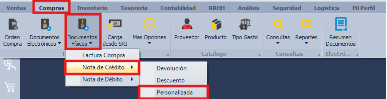 Desde el menú superior ingrese a Compras- Documentos Físicos- Nota de Crédito- Personalizada.