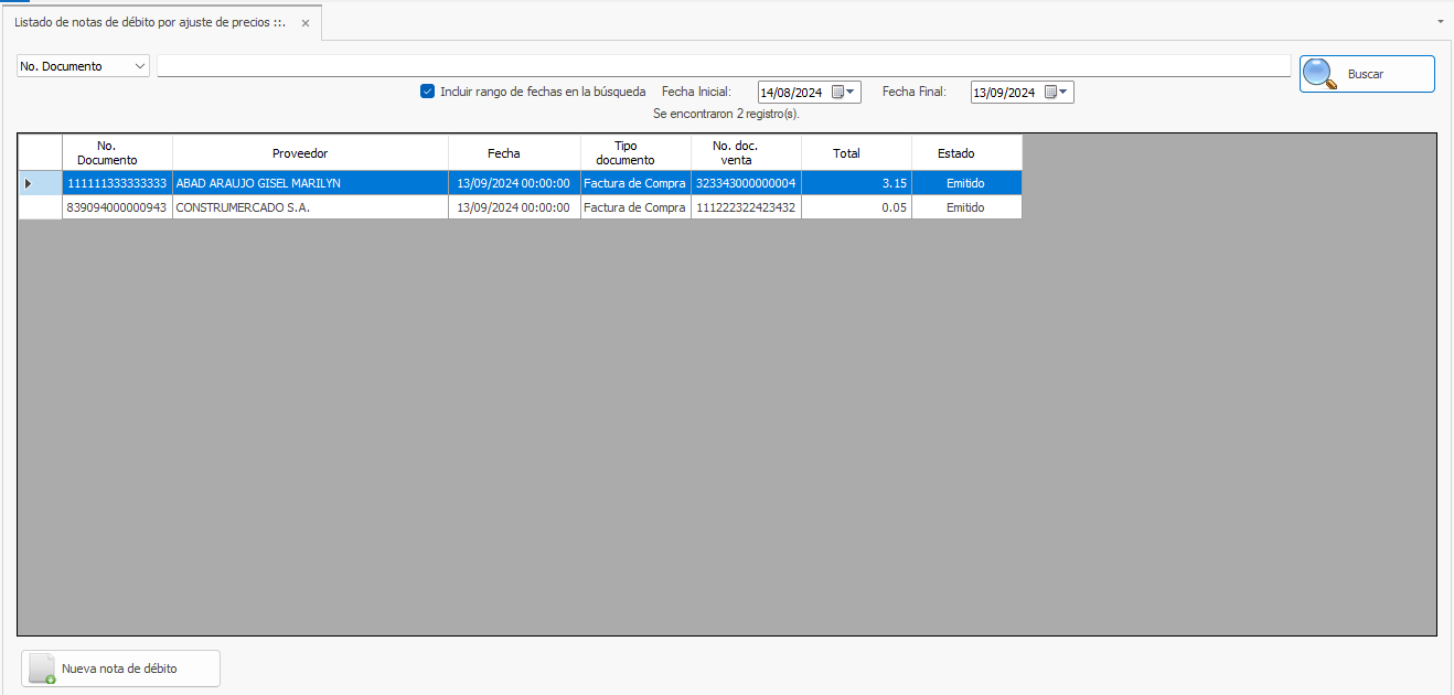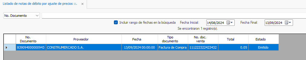 Se aperturará una nueva ventana con el nombre de Listado de Notas de débito por ajuste de precios.