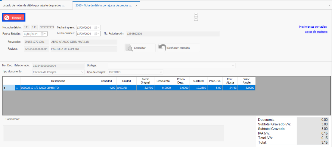 - Eliminar Notas de débito por ajuste de una factura de compras en el sistema EVA ERP.