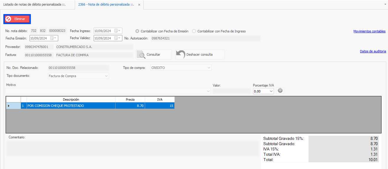 - Eliminar Notas de débito personalizadas de una factura de compras en el sistema EVA ERP.