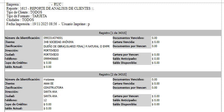 - Cliente: Muestra el listado de clientes registrados en el sistema. El reporte está ordenado por Nombre de cliente.