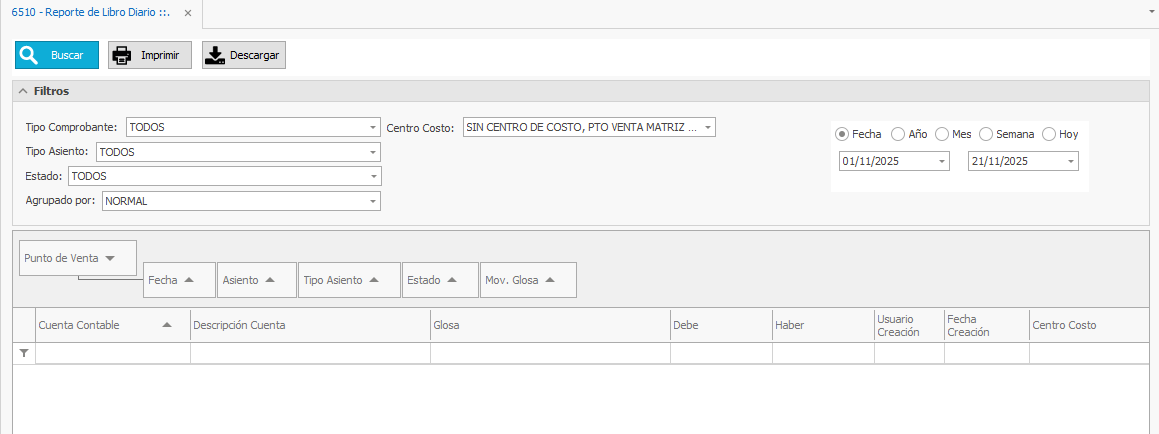 - Centro Costo: Podrá seleccionar los puntos de ventas disponibles en el sistema o buscar Asientos Diarios que no tengan asignado Centro de Costos.