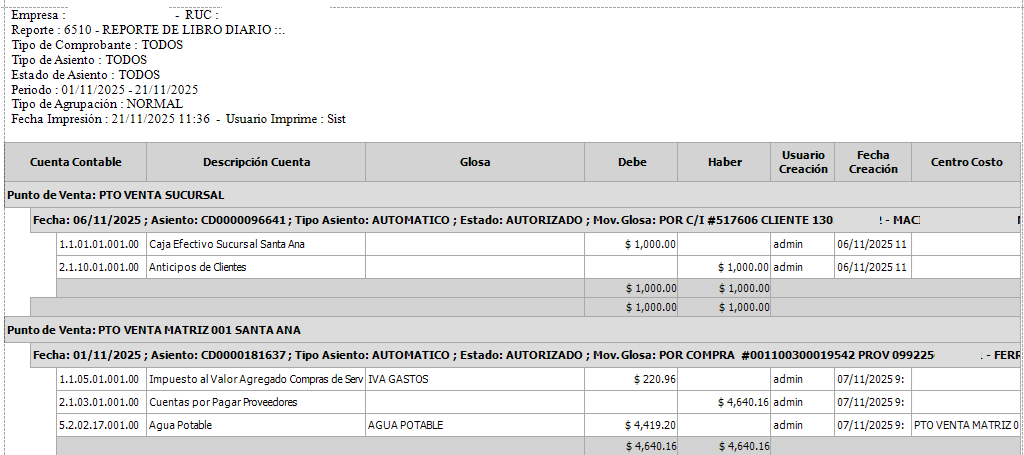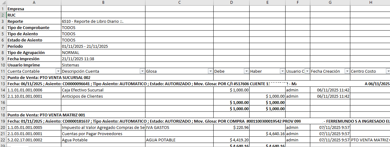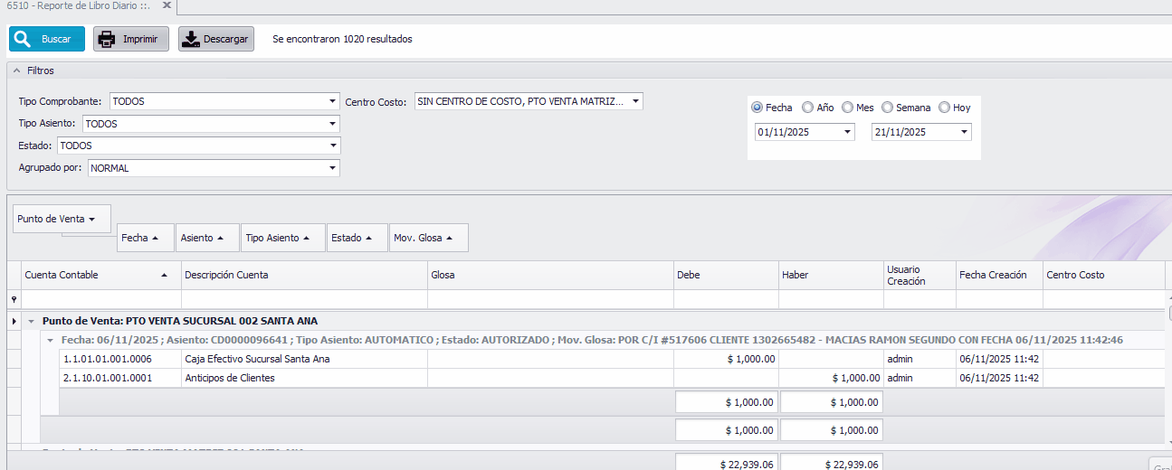 - Información Agrupada por: Punto de Venta, Fecha, Asiento, Tipo Asiento, Estado y Mov. Glosa.