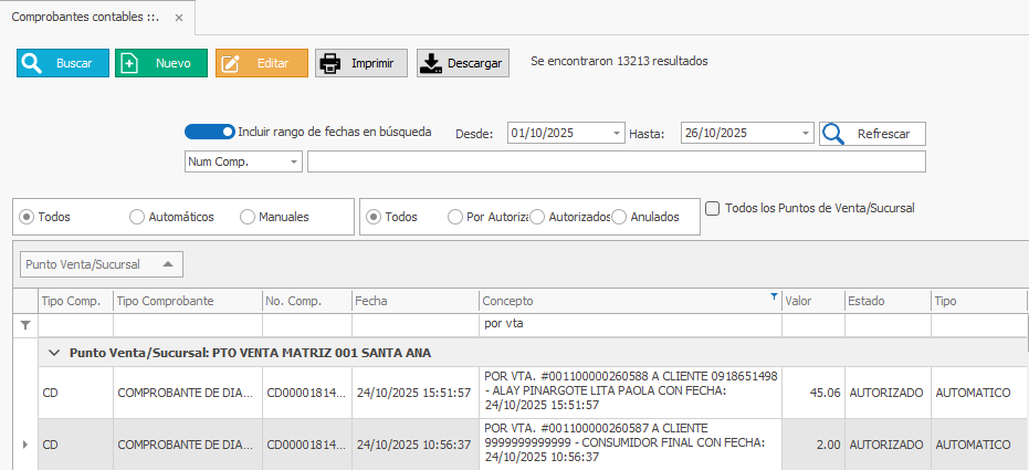 3) Puede realizar la búsqueda del Asiento Diario por Número de Comprobante, Tipo de Comprobante o Concepto.