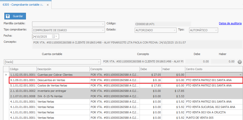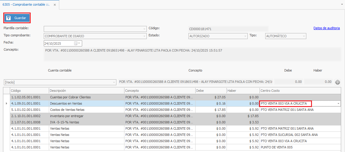 7) Luego de hacer el cambio de Centro de Costo, dar clic en el botón Guardar.